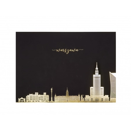 Czarna tekturowa pocztówka z zabudowaniami Warszawy. Wzór wytłoczony złotą folią. Rewers w kolorze kremowym.
