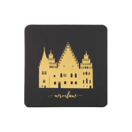 Zestaw dwóch tekturowych podkładek w kolorze czarnym. Wzór wrocławskiego Ratusza wytłoczony złotą folią.