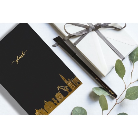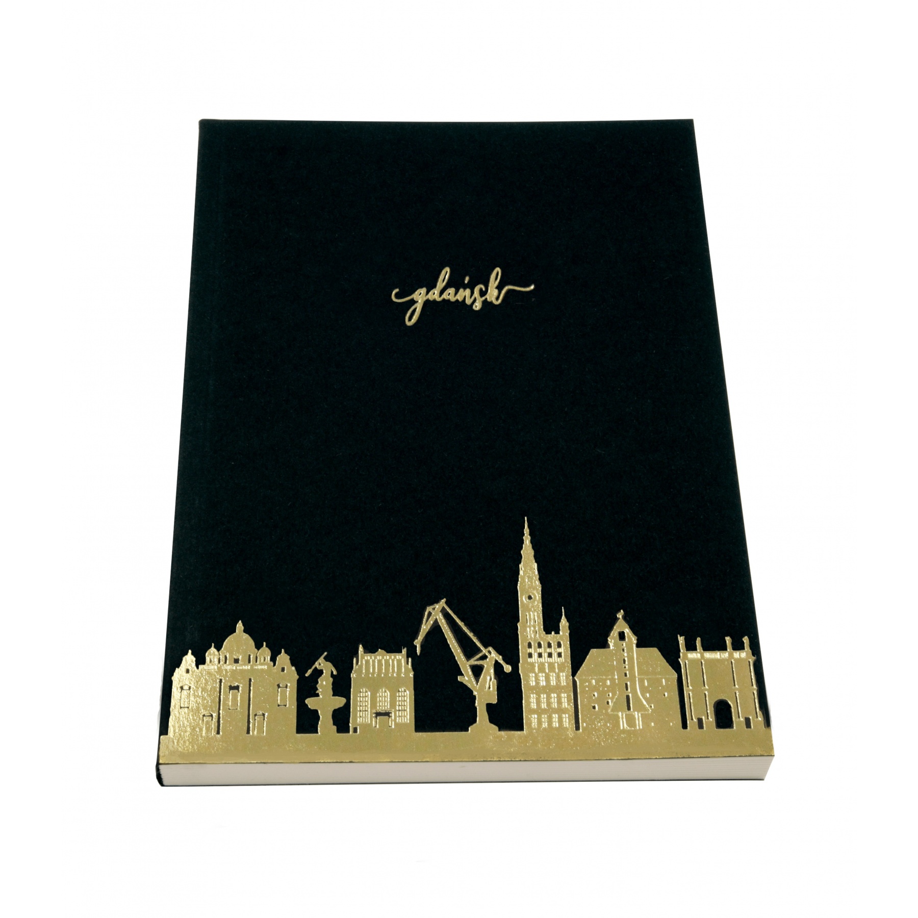 Subtelny złoty wzór umiejscowiony na dole okładki przedstawia jedne z najbardziej symbolicznych zabudowań Gdańska - Bramę Gdańską, Ratusz Gdański, Żurawia, Dwór Artusa, Neptun, Kościół Mariacki oraz Kaplicę Królewską. Ten elegancki notatnik zadowoli każdego miłośnika papierowych gadżetów.