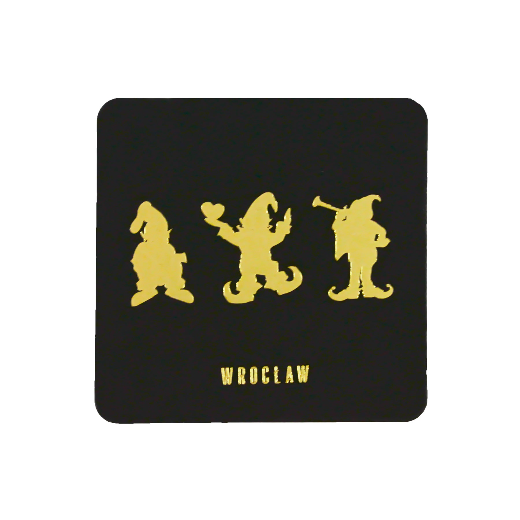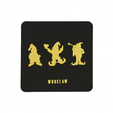 Zestaw dwóch tekturowych podkładek w kolorze czarnym z wizerunkami trzech krasnali. Minimalistyczny napis wytłoczony złotą folią.